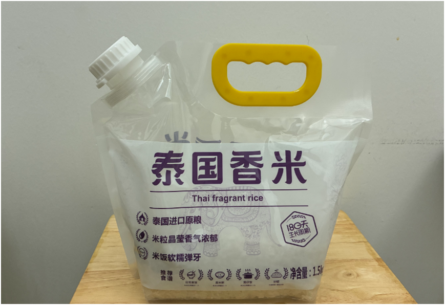 Convenient pouring control: The handle enables one-handed operation, allowing users to align the bag opening with a container while using the other hand to support the bottom or regulate the flow of rice. This facilitates precise pouring and minimizes spillage. For smaller bag formats, compatibility with Ruihua’s large-diameter dispensing caps—such as 33mm and 40mm nozzles—adds a premium, refined touch to the packaging solution.